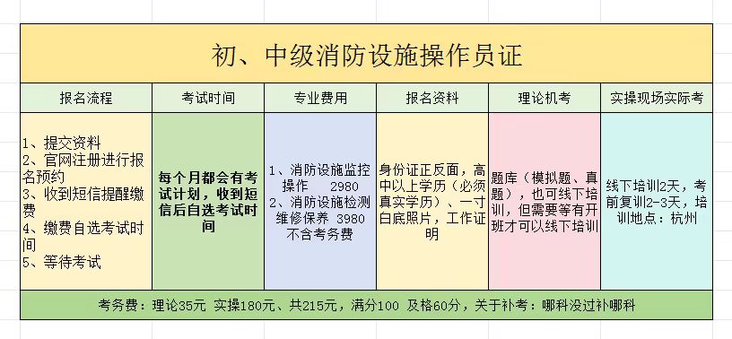中级费用: 中级消防设施监控操作:2980元+报考费215元;