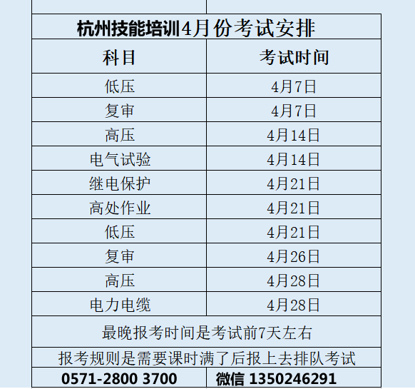 杭州四月考试安排:杭州低压电工,杭州高压电工,杭州电气实验,杭州继电保护,杭州高处作业证,杭州电力电缆。